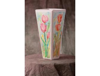 vase. Each side features groups of tulips ranging in colors from yellows, salmons, reds and purples. The watercolor paper is adhered to the vase with a matt medium in layers for maximum stay.