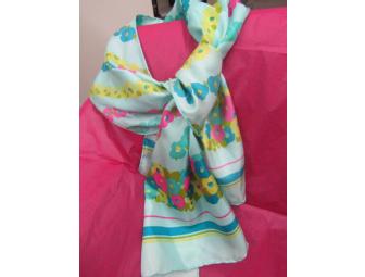 Lovely 100% silk scarf with bright, springtime colored blooms on a pale aqua background. Donated by VYOA parent, Amy Caldwell.