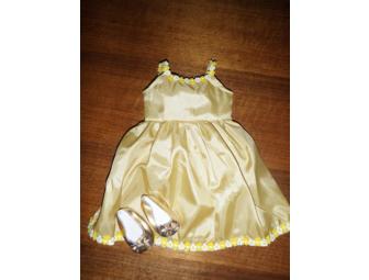 A lovely handmade party dress in pale gold with shoes in metallic gold to compliment. Made for an American Girl or a like-sized 18" doll.