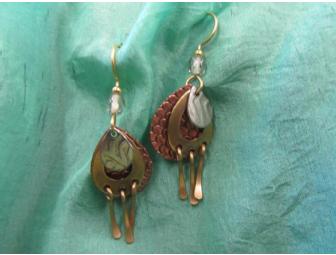 Copper, brass and antiqued silver teardrops combine with smoke glass beads to fall about 1 1/2". Handcrafted by Silver Forest in Bellows Falls VT. Donated by Amy Caldwell, VYOA parent.