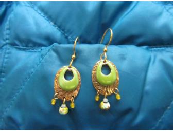 Exotic brass and green ovals host tiny yellow and multicolored beads, hanging just about 1". Silver Forest handcrafts these earrings in Bellows Falls VT. Donated by Amy Caldwell, VYOA parent.
