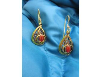 Carnelian stones grace filigree copper and olive teardrops, about 1" drop. Silver Forest handcrafts these earrings in Bellows Falls VT. Donated by Amy Caldwell, VYOA parent.