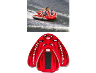 Start planning your summer fun on the lake with this water sporting toy for all ages. The RAVE Nighthawk is an inflatable towable that you pull behind a water ski boat. Comfortably fitting 1-3 riders, this multi-tiered, extremely stable tube features one rider slightly elevated above the two lower riders.