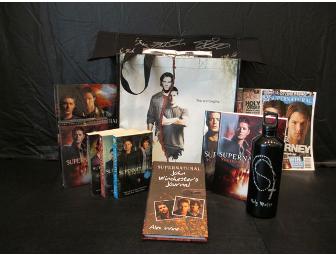 For fans of The CW’s hit show SUPERNATURAL, this bag offers a treasure trove of Winchester delights. It consists of a black cloth back from a director's chair signed by Jensen Ackles, Jared Padelecki, Misha Collins, Jim Beaver, Eric Kripke, Sera Gamble and Ben Edlund; a DVD set from Season 5; three paperback books of fiction: Nevermore, The Bone Key and The Unholy Cause; two softcover books: The Official Companion Season Four and Season Five; three Supernatural magazines: issues #20, #22 and #23; a decal water bottle; a hardcover book: John Winchester's journal; a hardcover book: The Supernatural Role Playing Game; and two pins.