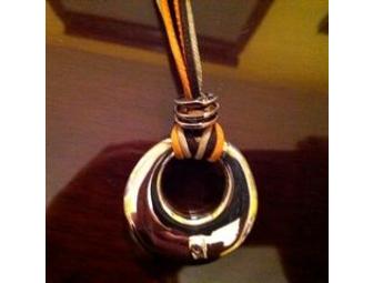 Artsy silver pendant hung from several 16" brown leather cords in various shades. From Fire and Ice, a store specializing in unique jewelry and fossils (www.fireandice.com).