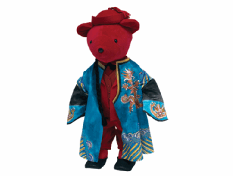 The world’s greatest detective is on the case of a cursed treasure chest from the Indian Rebellion of 1857. Sherlock Holmes travels to India in search of clues hoping to uncover the mysterious issues afflicting four Englishmen. Paxton Whitehead and Glenn Close starred in this 1978 play as Holmes and the woman who hires him. Our Sherlock bear is undercover in this Asian-themed robe made of turquoise silk with hand-painted dragons on the left breast and sleeves. The robe is trimmed in emerald and gold silk. If need be, though, he can throw off the robe and be ready to hit the streets in the red felt suit he wears underneath. Always stylish, Sherlock wears a matching red felt pill-box style hat with a tassel. His handmade, black slipon shoes are the perfect finish to this adventure-loving bear.