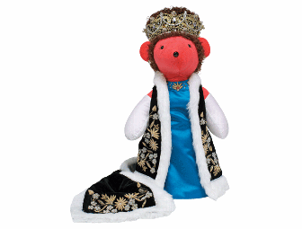 In the absurdist drama Exit the King, the sardonic Queen Marguerite declares: "The party’s over. People know that but carry on as if they didn’t.” And "carry on" is exactly what our Queen Marguerite bear does in her regal gown and cape. Made from blue satin, the dress is fully lined and adorned with beads, crystals and appliquéd trim, all meticulously applied by hand. Her cape is black velvet with white faux fur, appliqués and silver braid trim. She sparkles in her jewels as a royal should, with a crown made from brass filigree hearts adorned with lace, opalescent buttons and rhinestones atop her head. Her resplendent earrings are made from more of the same buttons. Our Queen bear wears a synthetic auburn wig styled to recreate the curls worn by Susan Sarandon in the Broadway production and completes the look with white peau de soie gloves. Bow down. All hail the queen!