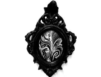 Cathie Bleck, an internationally respected artist is best known for her distinctive works in scratchboard and kaolin clay board. Her stylized forms are painstakingly cut through inks and handmade pigments, revealing the white of the kaolin clay beneath. It is a process similar in concept to woodblock printing.