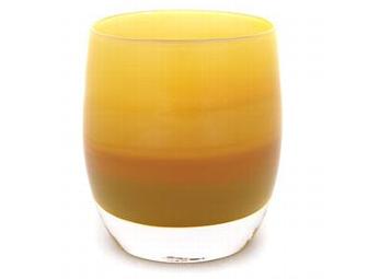 This opaque glassybaby is a deep saffron tone, accented with bands of bronze and burnt orange. When lit, the intricate color variations in the glass stand out, giving a warm golden glow.
