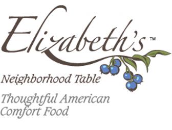$25 Gift Card to Elizabeth's Neighborhood Table Elizabeth's Neighborhood Table starts every dish with the freshest, most local and natural whole ingredients we can find. Thoughtful American Comfort Food to us means that every last ingredient has been thoughtfully chosen to reflect it in its most natural state. By working directly with farms and co-ops, and sourcing organic, biodynamic and unadulterated natural ingredients whenever possible, we have crafted a menu which brings you back to your grandmother's table. Back to when everything was local, natural, and organic! Enjoy!