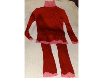 Mary Green Silk long underwear is pretty enough to wear on the outside! Keep warm with this beautiful size small set of silk knit long johns trimmed in stretch lace. Long sleeve Turtleneck and matching pants in deep red.