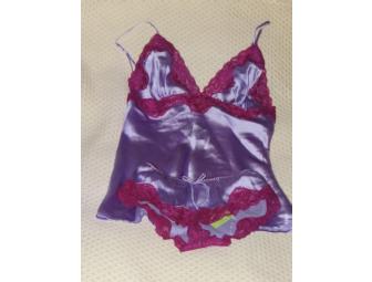 Forget your cotton pj's tonight! Sleep in this luxurious silk camisole set and have sweet dreams! Silk charmeuse camisole in lavender with berry lace trim and matching boy short in size small.