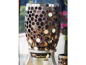 Miranova Hurricane Candle Holder - 12 1/2 inches high, 6 1/2 inches in diameter. Hand-applied colored and mirrored glass dot tiles create a playful vibe. Metal accents add a finishing touch. Comes with silver tone stand. From Partylite collection. Use with round pillar, tealight tree, large tealight tree, votive cup, jar.