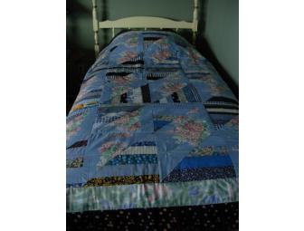 Lively quilt in blues and florals. Machine stitched with some hand quilting. Quality fabrics. Opposite side is navy and oxford blue plaid.