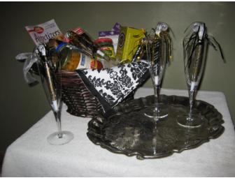 Basket includes an apron, candle and jarred goodies, truffles, gourmet cookies and crackers, 4 champagne flutes and a silver serving tray!