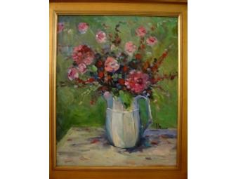 This gorgeous 30 x 40 still life oil painting on canvas is of a bouquet of pink flowers. It will adorn your entry, living room, family room or bedroom.
