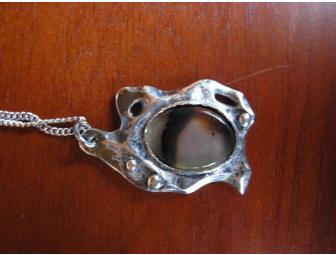 Intriguing agate pendant necklace on 24-inch metal chain. Pendant is 2 1/4 X 1 1/2 inches.
