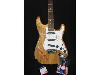Katy Perry signed, full size, fully functional electric guitar. Complete with certificate of authenticity, photo of Katy signing the pick guard, and guitar carrying case.