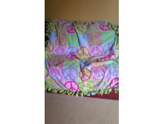 Cozy fleece blanket suitable for all children and adults. Solid lime green on one side and pastel color floral peace signs in floral background blocks. The blanket was tied with love by the kids of Mrs. Bosworth's and Mrs. Wooten's class.