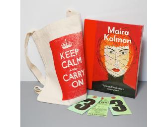 This item from the Institute on Contemporary Art includes a Maira Kalman exhibition catalog, a "Keep Calm and Carry On" tote bag, and 3 'pickle tags' (a trademark illustration by the artist).