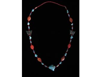 This unusual beaded necklace boasts 28 inches of faceted and smooth beads in shades of red and turquoise with butterfly accents. The finishing touch is a large turquoise colored bead.
