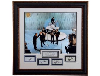 When The Beatles made their first appearance on The Ed Sullivan Show that February 1964, it was and remains the most important event in the history of rock music. This 16x20 photograph also includes the laser engraved signatures plates of the each member of this historic band. The photograph comes professionally framed in a museum quality frame. Item Measures 32x32.