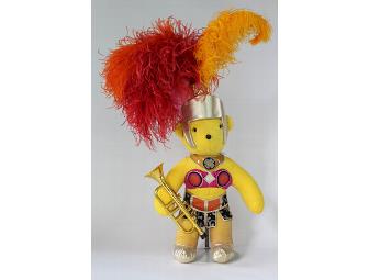 With vaudeville fading, Rose tries valiantly to keep her stage mother dreams alive with daughter Louise, but they land in a Kansas burlesque house. Three of the strippers there – Mazeppa, Electra, and Tessie Tura – do their best to help introduce Louise to the life with their signature song "You Gotta Get a Gimmick". Our Mazeppa bear is based on the original 1959 production of Gypsy, with original costume design by Raoul Pene DuBois and worn by Faith Dane. DuBois earned a Tony nomination for the costumes. Our Mazeppa bear wears hot pink silk underpants beneath her sexy Gladiator-esque stripper outfit. The black and gold hand-painted fabric tabs are bound in gold lamé. The hot pink silk bra is constructed with gold lamé, black velveteen and pink and orange silk. Silky stockings and gold shoes adorn her legs. The accents of gold, black and yellow complete the look. The gold gladiator helmet is expertly created by Rodney Gordon Inc. and topped with luscious orange, red, yellow and pink plumes. Finally, no Mazeppa is complete without her signature trumpet.
