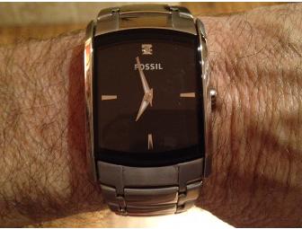 New Fossil Men's Three-Hand Stainless Steel Black Dial Dress Watch in decorative tin with warranty/instructions and extra stainless steel links.