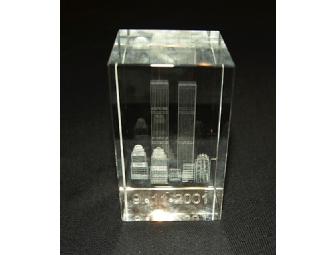 A beautiful 3-D laser etched crystal cube of the NYC World Trade Center.