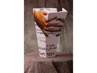 Handwritten messages from multiple individuals of “just hold it together…” scribed onto a “broken” vase held by two hands.