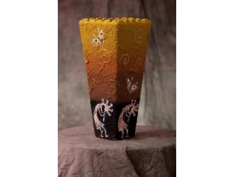 Native American artwork was the inspiration for the vase. The artist used sand and gel medium with an airbrush. This vase has a wonderful tactual texture from the sand.