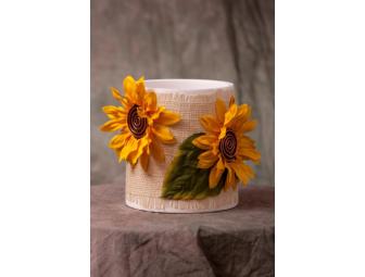 Kansas Day and Sunflowers, our State Flower, were the inspiration for this vase. Irene used mixed mediums including burlap, metal and silk flowers.