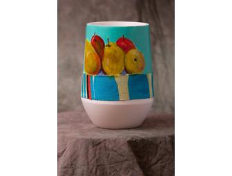 Sharon painted her favorite subject, pears, using acrylics. The bottom of the vase was made by West African men weaving on the loom. She had bought this at an exhibit at the Garden City Arts Center. Her husband is currently fighting a cancer battle and Sharon feels that one day they may need Hospice services. Sharon decided this was one way that she could help contribute towards Hospice.