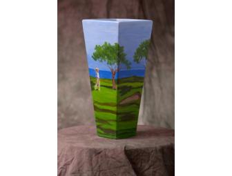 This vase donated by Gary Woodland of Topeka Kansas. Gary is a Prfessional Golfer and a PGA Tour Player. The vase features a life-like golf scene done in enamel acrylics.