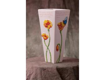 This vase was inspired by the beauty of life given by God. Decorated with glass bead flowers and butterflies, Connie also adorned it with lovely verses. “Feel the flutter of soft wings landing and laugh for a little while…”and, “Drink up the warmth of the suns rich tonic and dance in the sudden breeze…”