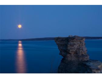 What an extraordinary photograph taken by Doug Loman! This photograph of Miner's Castle in Pictured Rocks National Lakeshore was taken in May of 2011 and features the full moon setting behind the rock formation. The artist was able to capture the image as the sun was rising. The size of the print is 36" x 54" (3ft x 4.5ft) so it is quite large. The photo is printed onto a sheet of aluminum framed with aluminum channel rails, giving viewers a true to life image. Shipping is not included in the bid price. You can view this photo in person at Zero Degrees Artist Gallery in Marquette,MI.