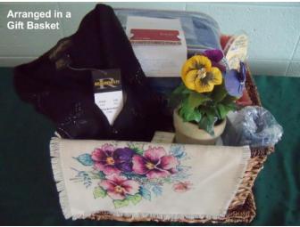 In addition, a gift basket accompanies the gift card and contains a 50" x 62" heated plush throw; bath soaps; "magnetic therapy" bracelet; butterfly necklace; pansy pin; blue vase; pansy flower pot; pansy placemat; size extra large hand beaded vest and two "cherished teddies" decorations.
