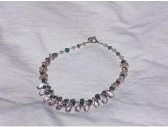 Necklace of pink crystal droplets with clusters of aqua crystal accents.