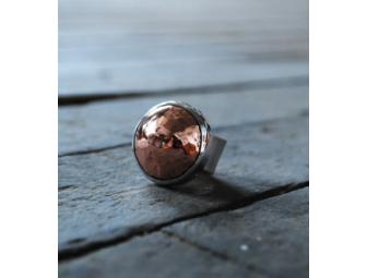 For this ring, Katie Johansson turned a metal into stone. It is hand domed & hammered copper, set in sterling. Round Copper stone measures 23mm in diameter. Size 7 (approx.)