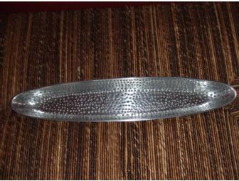 This beautiful silver colored serving tray is decorated with a pounded nail pattern, measures 19" long and is 3.5 inches across at the widest part.