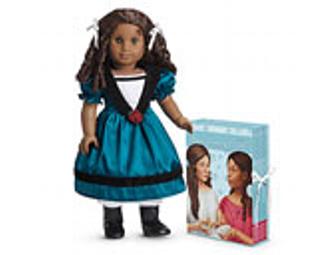 Cécile opens up a whole world of imaginative play, & comes with authentic styles from 1853: a teal satin dress with puffed sleeves, black velveteen accents, & rosette adornments, lacy white pantalettes, knee-length stockings & black boots with button details, & long, dark brown hair styled in ringlets & tied with ribbons.