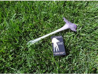 Artist Joel Bloomberg created this beautiful blown glass Iris. Lilac and green glass make this a beautiful piece of art. It measures approximately 10 inches in height and flower has an approximate 3 inch diameter. Makes a beautiful Mother's Day gift.