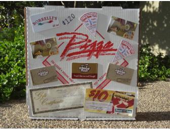 This Pizza Box is covered in $120 in gift cards from all of our favorite pizza and pasta joints, Round Table Pizza, Pizzicato, Flippin' Pizza, Rosanna's Pasta, and Borrelli's.
