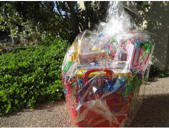 BIG red tote is loaded with Family fun! 8 games in total plus Sodoku and crossword puzzle books, and snacks of popcorn, 8 red Popcorn containers and lots of candy.