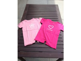 Two Girls Rompers in Fuschia with Heart "Pu'uwai" design and in Pink with Blossom "Pua" design. Size 18mos.