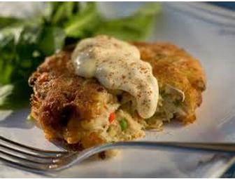 Relax and enjoy a delicious crab cake dinner with wine and carrot cake in the comfort of your own home! This meal for four will be prepared and delivered to your home on a date mutually agreed between winning bidder and donor (please give at least one week's notice).