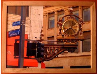 Iconic Pittsburgh photo with a real clock imbedded in it, size is 12" X 18" with a maple frame.