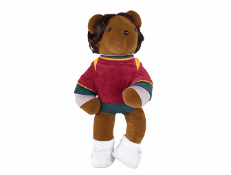 “Perfectly simple or simply perfect?” This was the description of Theoni Aldredge’s classic designs for the unforgettable 1975 Broadway musical A Chorus Line. Standing in the pose made famous by Priscilla Lopez, Broadway’s original Diana Morales, our Diana bear stands attentively on “the line” with a hand on her hip and knee bent. She is dressed simply in her dancer’s layers, ready to dance for her life – and for the role in director Zach’s next big Broadway musical. Her football-style jersey in maroon and dark green velvet is accented with vivid, golden trim around her shoulders, neck and arms. Under the jersey, our Diana bear wears a grey and mauve-toned turtleneck. Her dark green dance pants match the trim on her football jersey. On her little feet are handmade white canvas sneakers and white ankle socks, perfect for pounding out a jazz combination with unparalleled technique and passion. As a finishing touch, we’ve recreated Priscilla Lopez’s signature hairstyle of short, dark brown locks. What will you do for love? Bid perhaps?