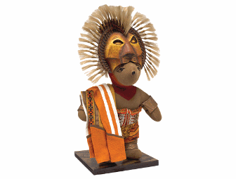 He just can’t wait to be king! Simba is destined to be the king of the jungle and his regal dress shows it. Our Simba bear is dressed in a corset made from multicolored beads strung by hand to create this replica of the original costume by Tony Award-winner Julie Taymor. This corset represents more than 30 hours of painstaking construction in an exquisitely detailed pattern. His pants have been digitally printed on fabric in the same design from the show. The removable cape, draped over his shoulder as it is in the show’s finale, is digitally printed with the same pattern. Simba also wears hand-painted cuffs around his arms and ankles, as well as red paint around his neck and shoulders. However, the pièce de résistance of this incredible costume recreation is the sculpted lion’s-head headpiece adorned with more than 50 meticulously handmade plumes. The headpiece is also painted by hand to the exact specifications of the wardrobe supervisors. Can you feel his love tonight? You will if you are the high bidder on this masterpiece of craftsmanship.