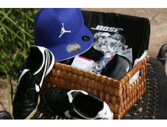 Basket includes blue Air Jordan baseball cap size 7 3/4, US 5 Youth Nike Black Sports Shoe, cologne and carry case from various shops in Folsom's Premium Outlet stores.